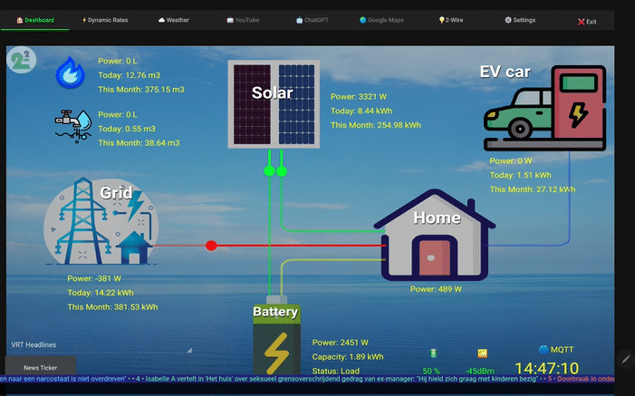 In de “demo versie” zonder eigen 2-WIRE server en MQTT Token zijn praktisch alle functies beschikbaar, maar je kan bij “settings” een eigen 2-WIRE MQTT Token en MAC adres gaan invullen zodat de verbruiken van je eigen woning “live” worden getoond.